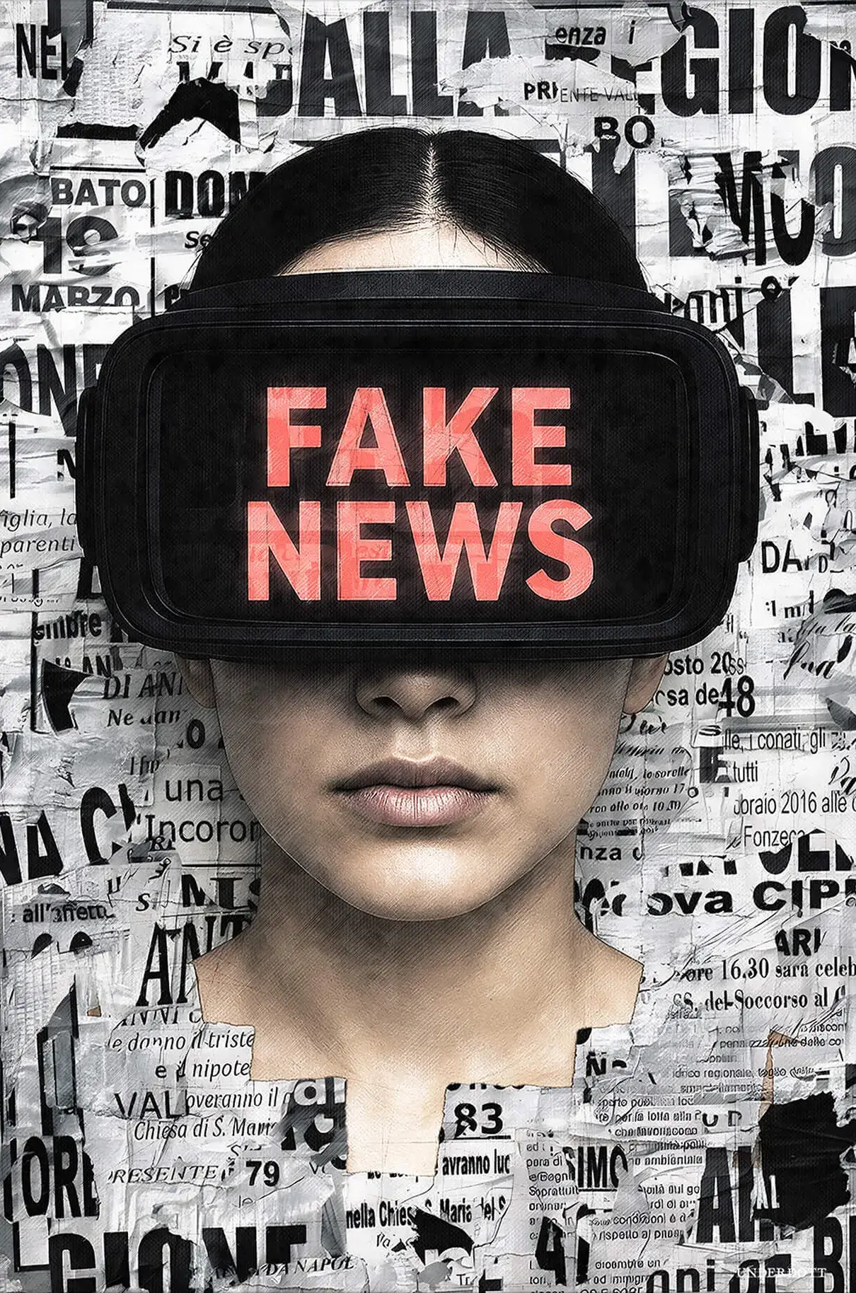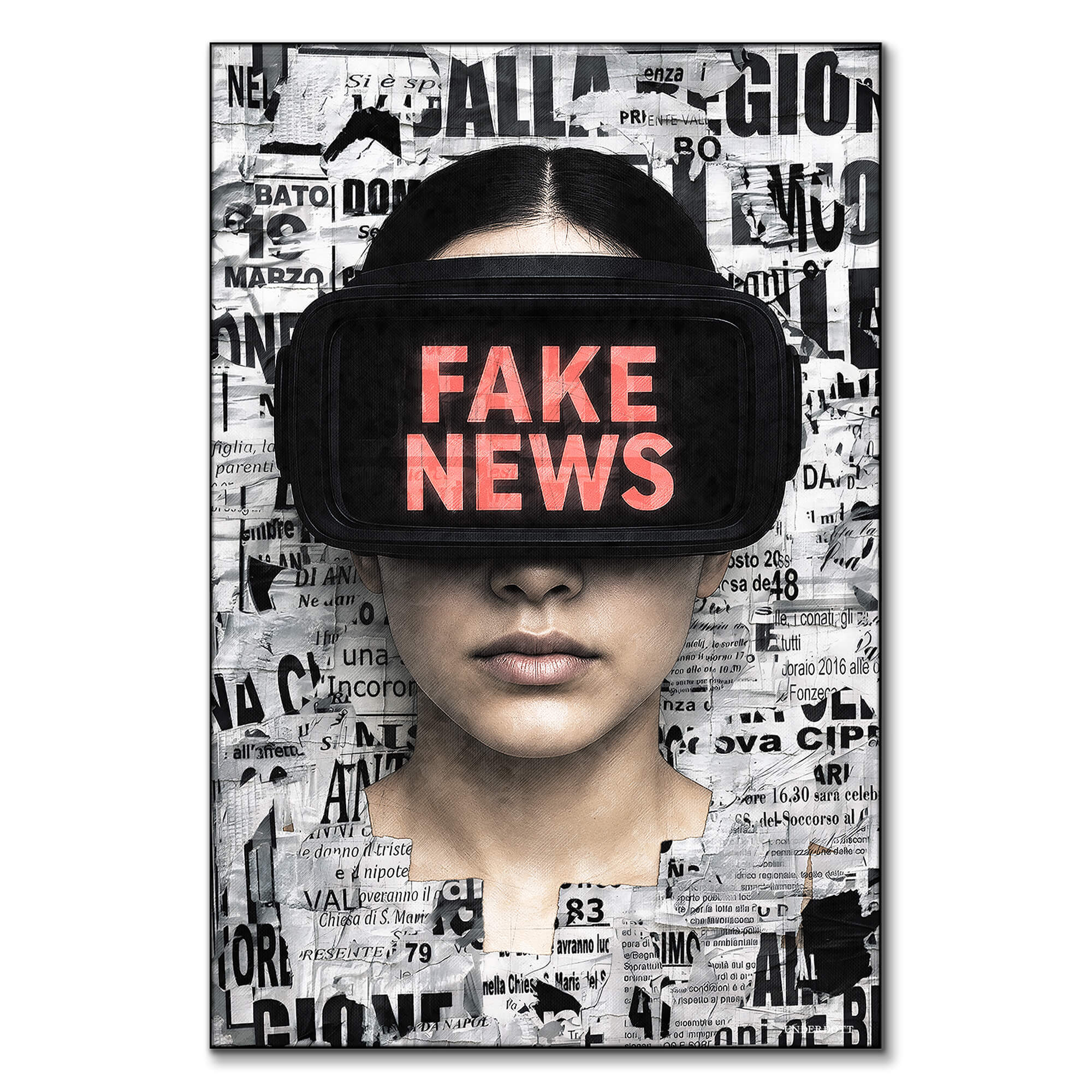 This artwork captures the unsettling overlap of media, identity, and perception in a single image. A woman stares forward, expression calm, while a black headset reading “FAKE NEWS” covers her eyes. Behind her, a collage of headlines fills the frame, creating a visual noise that mirrors the modern information overload.