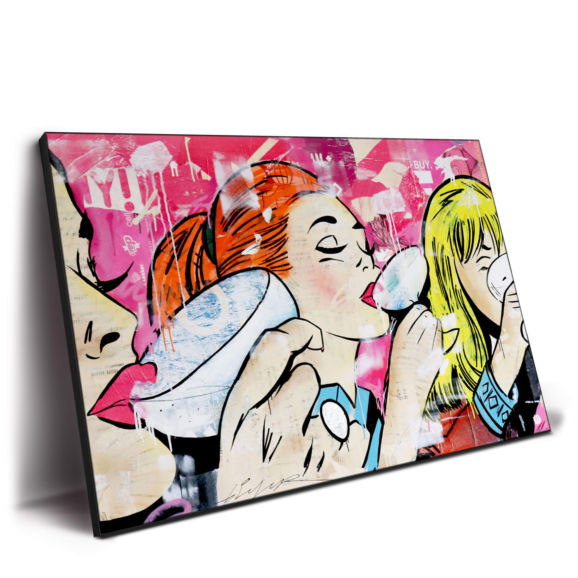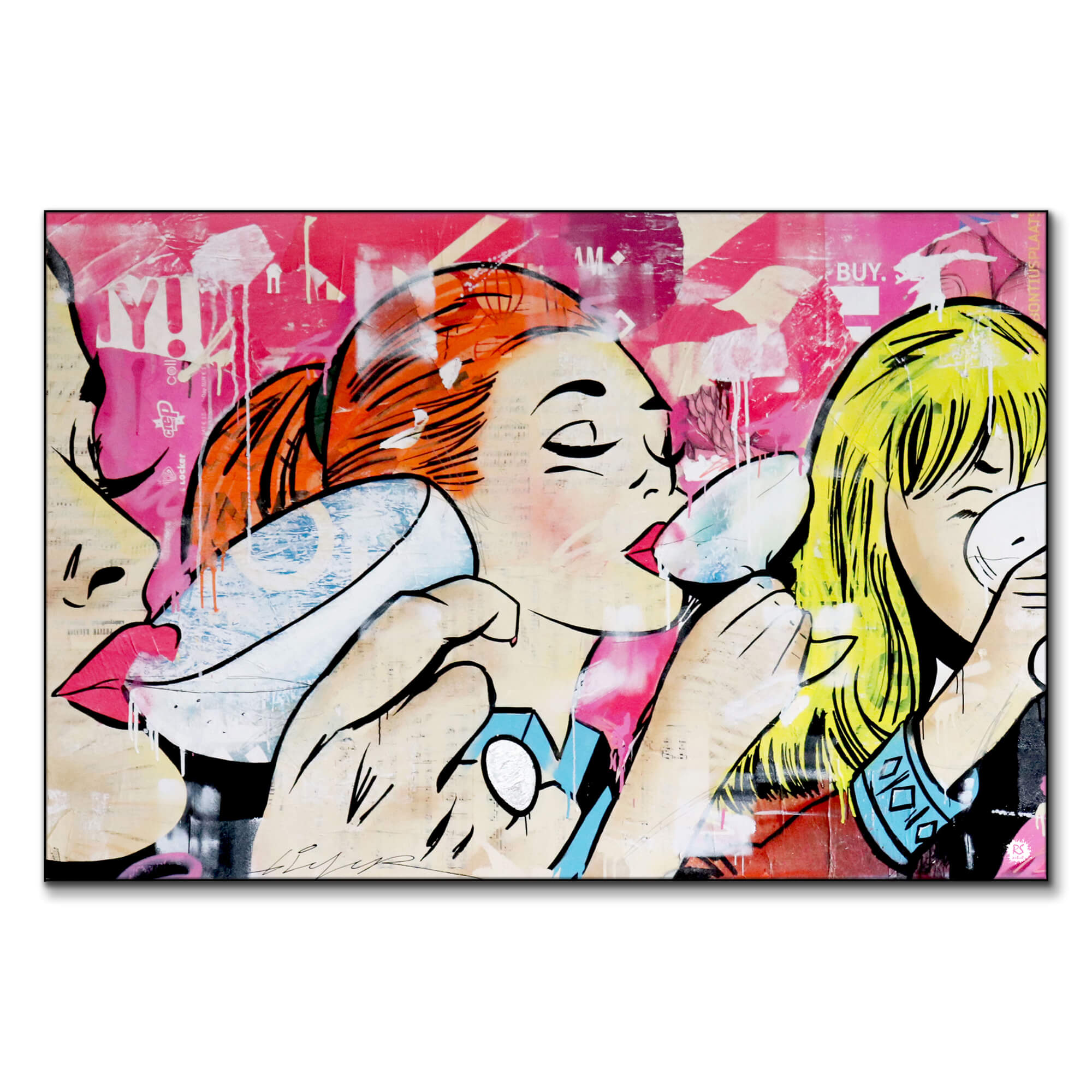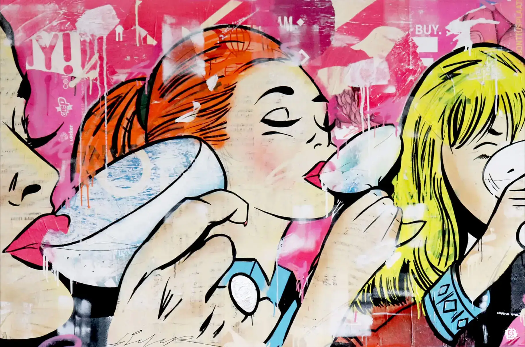 Vibrant pinks and expressive faces bring to life a scene of three women enjoying a spirited moment over martini glasses. Their style and joy are a celebration of friendship, captured in bold lines and lively pop art flair. Each sip seems to echo with laughter and shared secrets, a perfect blend of modern chic and timeless enjoyment.