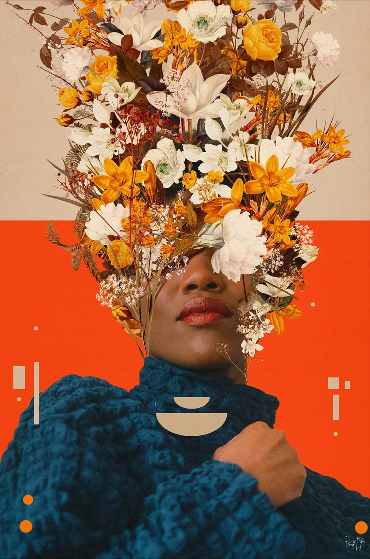 This vibrant floral portrait blends bold color with contemporary surrealism. A woman’s face is hidden behind a lush bouquet of yellow, white, and orange blooms, arranged in a cascading composition that radiates warmth and energy. The deep blue texture of her sweater contrasts beautifully with the bright, structured background, creating a perfect balance of softness and strength.