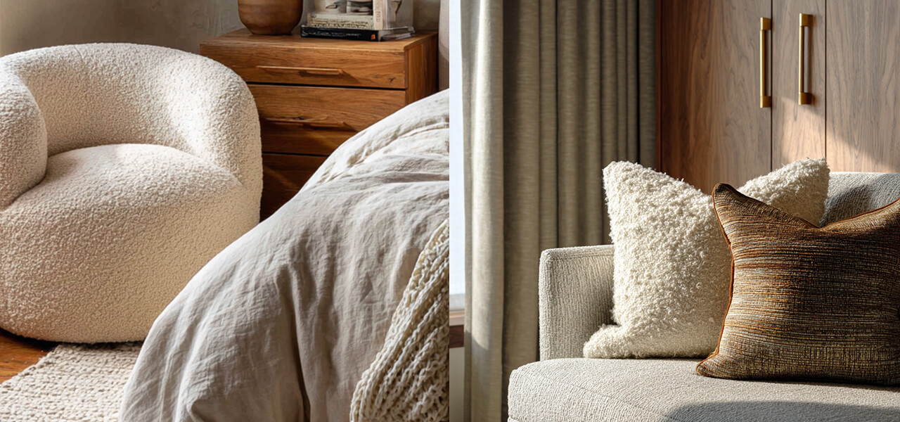 Think about the rooms you save from designers or Pinterest. They never look flat. There is always depth. Grainy wood furniture, soft boucle or linen upholstery, matte ceramics… this whole look pairs perfectly with minimalist wall art if you want a calm, natural aesthetic. You can almost feel the materials simply by looking at them. That is texture doing the work.